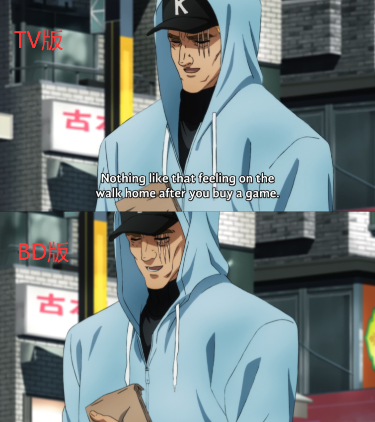 除此之外,还有一些细节的修正。比如KING登场的这一幕中,BD版增加了服装的褶皱细节,帽带部分有明显的修正,面部线条也更加干净。此类的小幅修正出现了很多次,总体来说这个BD还是挺走心的。当然,没法跟《刀剑神域3》那种大刀阔斧的加特技相提并论。