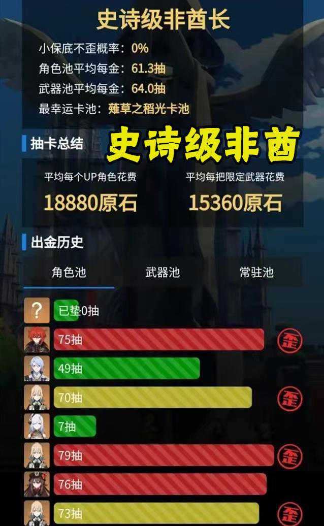 史诗级非酋长:这位玩家的小保底不歪概率是0%,换句话说,就是必定会歪;角色池每金61.3抽,武器池每金64抽,最幸运卡池-薙草之稻光卡池,平均每个up角色花费18880原石,平均每把限定武器花费15360原石。