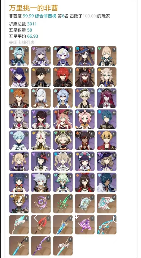 龙百万点评:看角色池,幸好这位玩家的抽卡次数不多,要是常年抽卡,还能保持这种数据,那真是要被气得中风了。