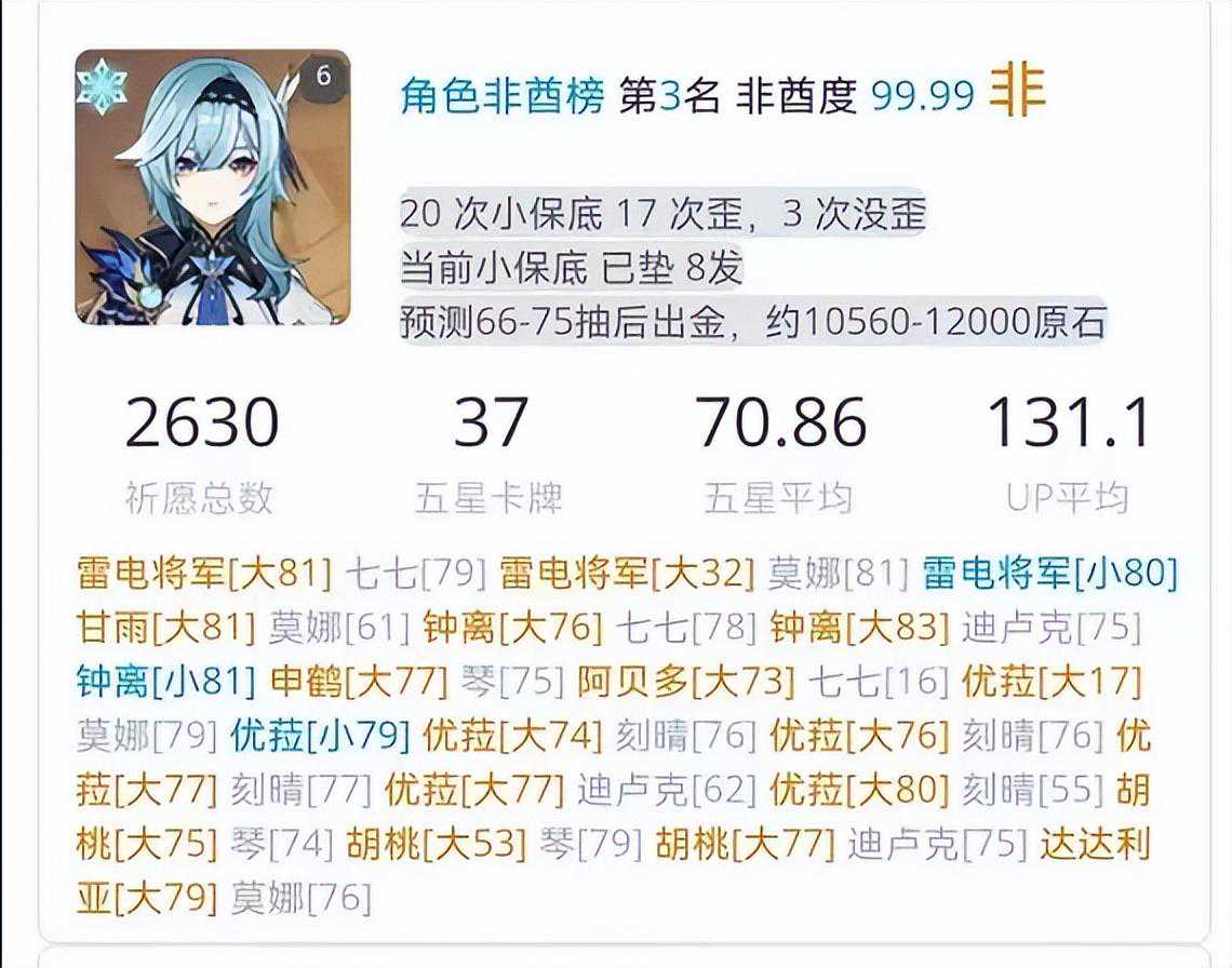 上图所示是这位非酋大哥的详细资料,他在角色非酋榜中排名第三,20次小保底17次歪,3次没歪,当前小保底已经垫了8发,官方预测66-75抽后出金,约花费10560-12000原石。