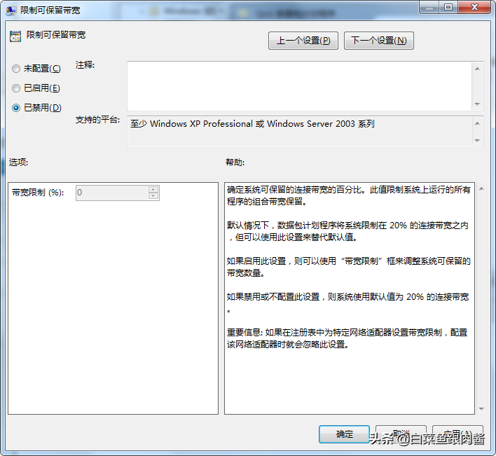5最后在弹出来的“限制可保留宽带”页面中,将这项功能禁止使用就可以了。