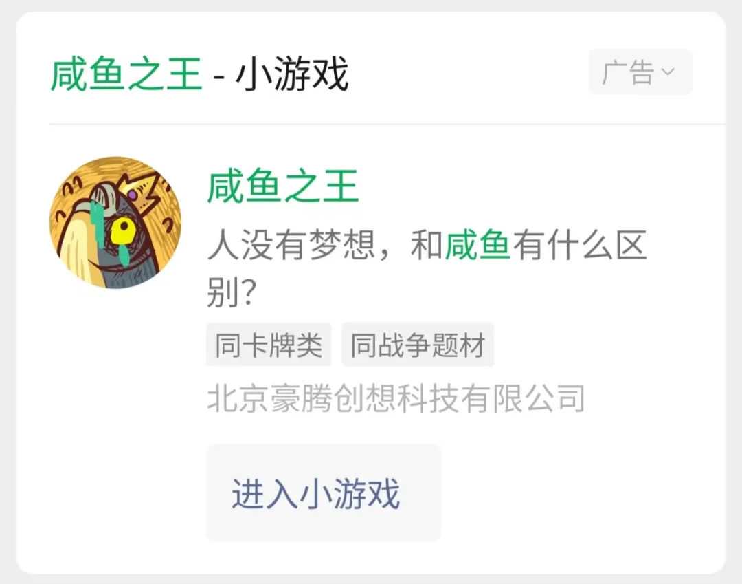 二者兼备当然意味着理论上更丰盈的利润空间,所以日后成为小游戏翘楚的《咸鱼之王》等产品基本都采用了这一思路。至此,混合变现的流行意味着小游戏的商业链路趋向成熟,中小开发者能迅速在这套规则下跑起来,为赛道壮大奠定了基础。