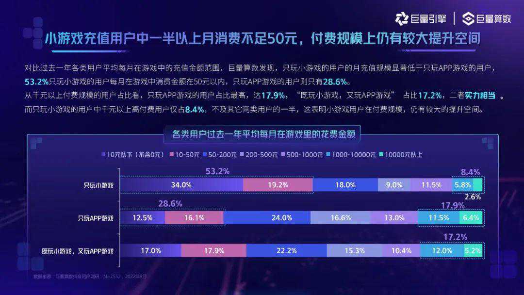 根据《2022抖音小游戏用户洞察报告》,只玩小游戏的用户月充值规模显著低于只玩APP游戏的用户。53.2%只玩小游戏的用户每月在游戏中消费金额在50元以内,作为对照,这一比例数字在只玩App游戏的用户中仅为28.6%。