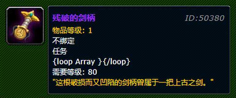 《魔兽世界》3.3.5版本中,玩家已经可以进入新三本(灵魂洪炉,萨隆矿坑,映像大厅),从副本中的小怪掉落中获取这个神秘武器任务的开启物品:残破的剑柄。