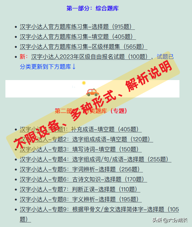 2)汉字小达人历届真题(近2000道)在线练习(包括2-10届区级样题中的选择题、判断题和成语填空题)。不限设备、随时随地、反复练习,自动判卷并且可以查看历史记录和错题,大大提高“刷题目”的趣味性和效率。