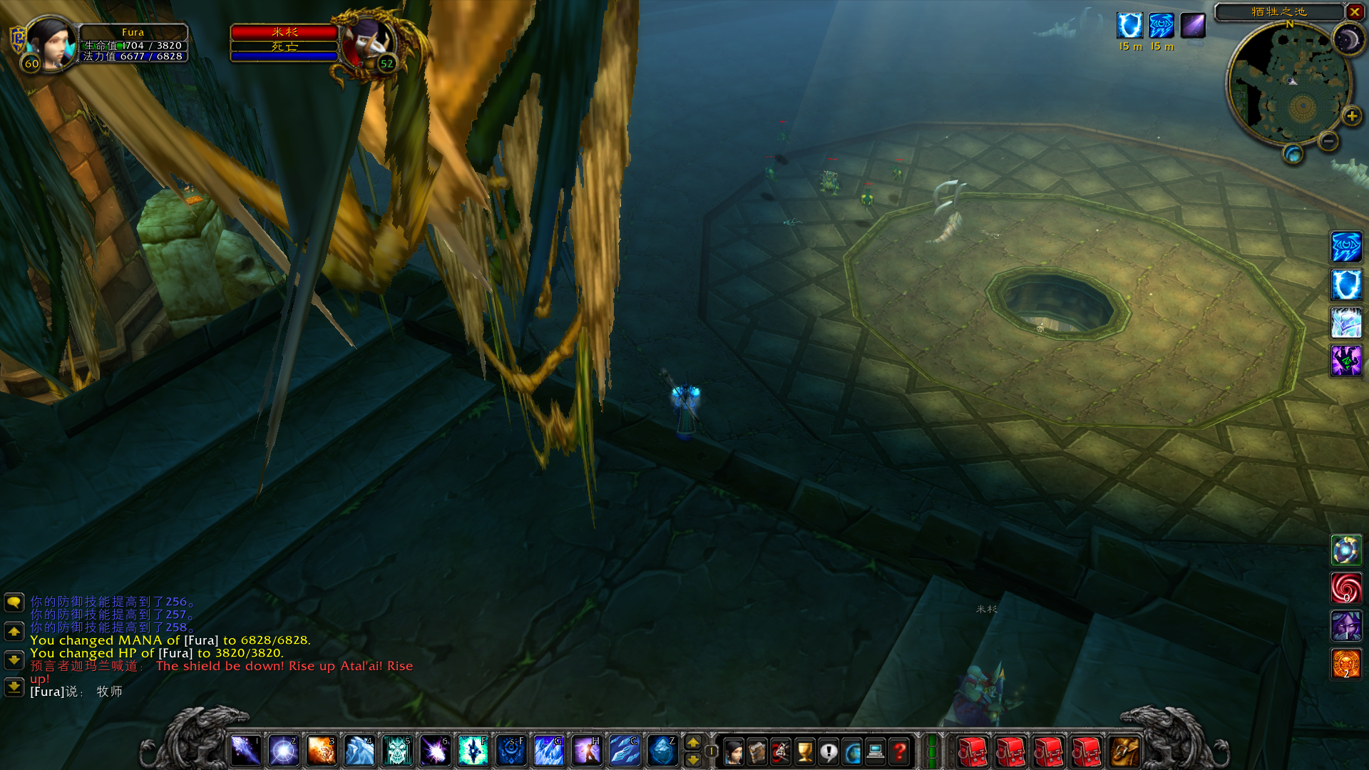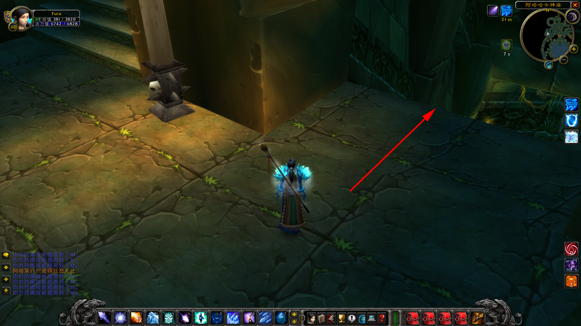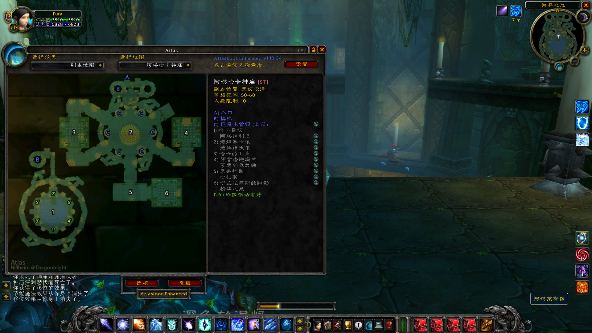 最后补一张图,当你走近大厅中央,可以看到地板上有一个洞。洞里是什么?没催,就是底层的哈卡祭坛,卫像者阿塔拉利恩所在的房间。在以前,老玩家还是萌新的时候,很多人会在清完上层神庙之后,再跳下去打下层。死得老惨了,这多高啊