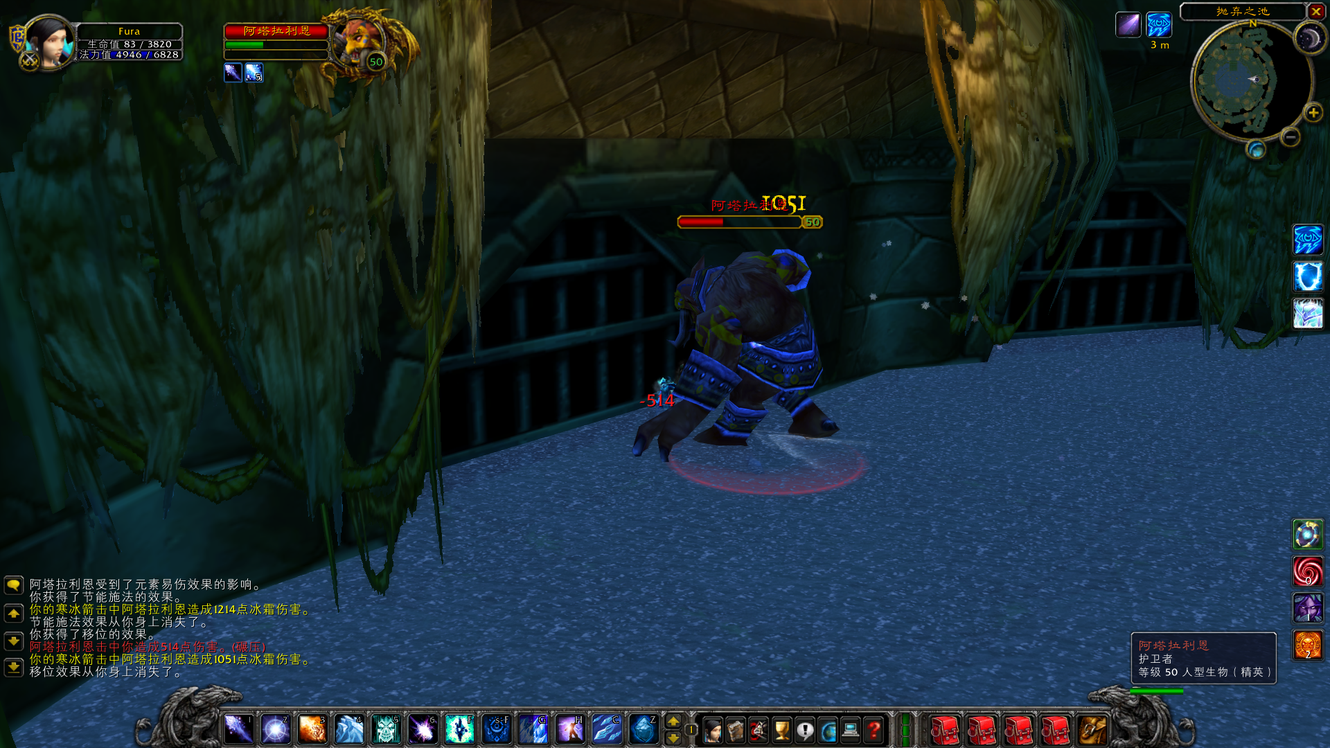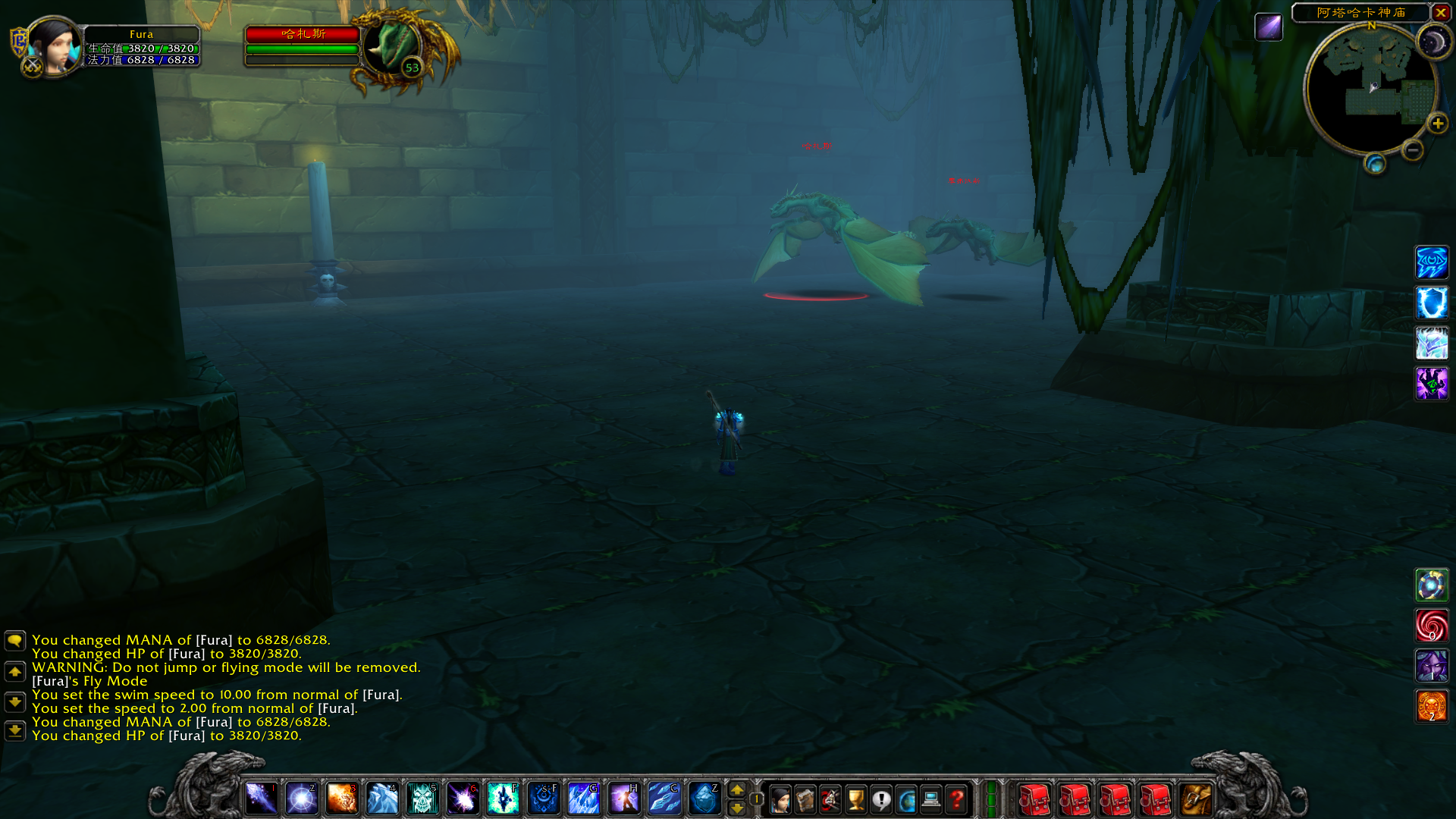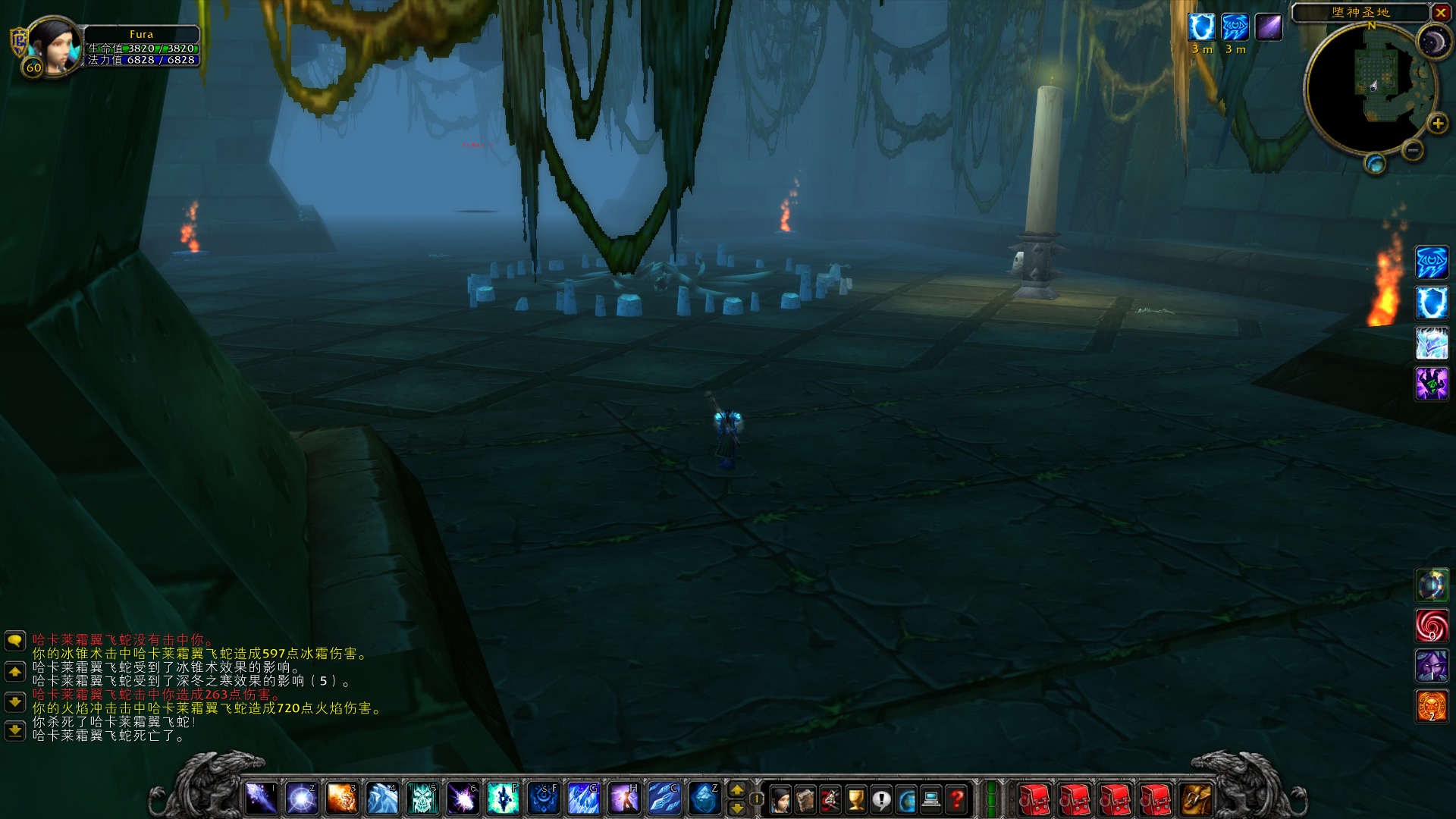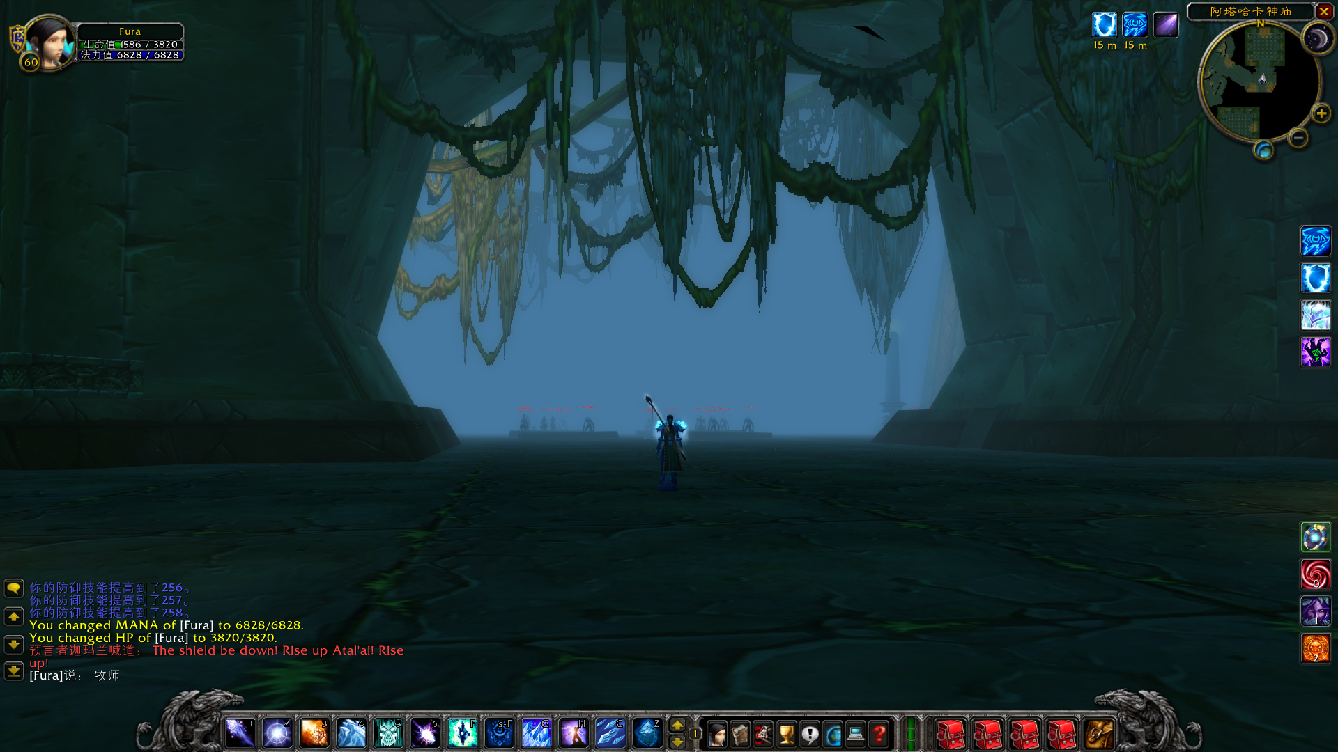 最后补一张图,当你走近大厅中央,可以看到地板上有一个洞。洞里是什么?没催,就是底层的哈卡祭坛,卫像者阿塔拉利恩所在的房间。在以前,老玩家还是萌新的时候,很多人会在清完上层神庙之后,再跳下去打下层。死得老惨了,这多高啊