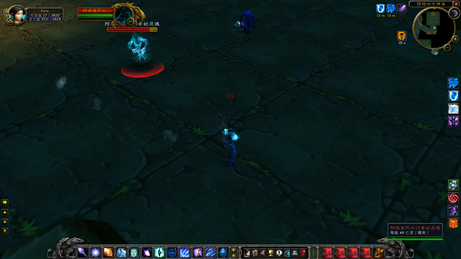 处理这个房间时务必小心且耐心。将每一组怪物单独拉出,在后方击毙。原因是有一种怪物叫做阿塔莱死亡行者,在存活的时候他们不停地施放恐惧术,非常容易ADD。死亡后又变成幽灵,伤害奇高且不可攻击,但移动缓慢,需要场地风筝。如果不小心ADD,亡灵怪物可以由牧师束缚,人型怪物法师变羊。
