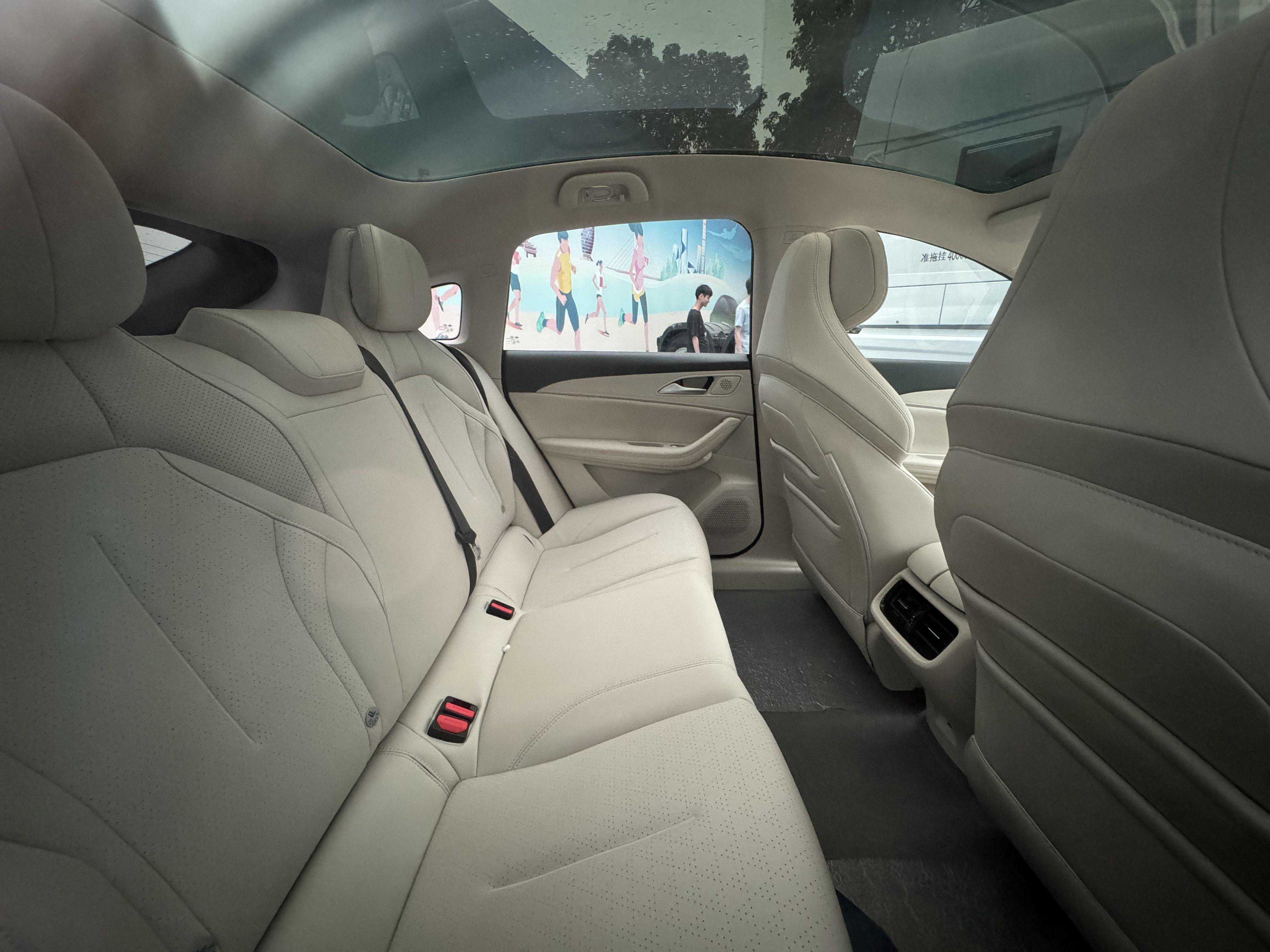 该车的后排空间谈不上多么宽敞,可也不局促,家用够用,还配备了一块大面积的全景天幕,不过没有配备遮阳板。