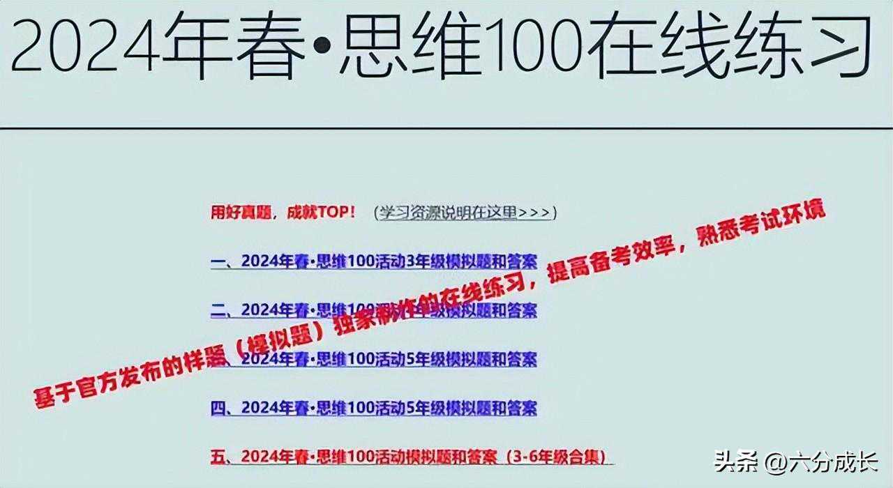 官方发布的2024年春季思维100活动三四五六4个年级的82道样题我已经全部做成了在线版本,可以反复刷题,吃透了这些样题,参加比赛更有胜算。