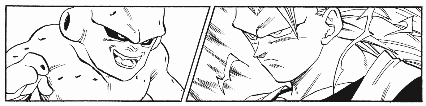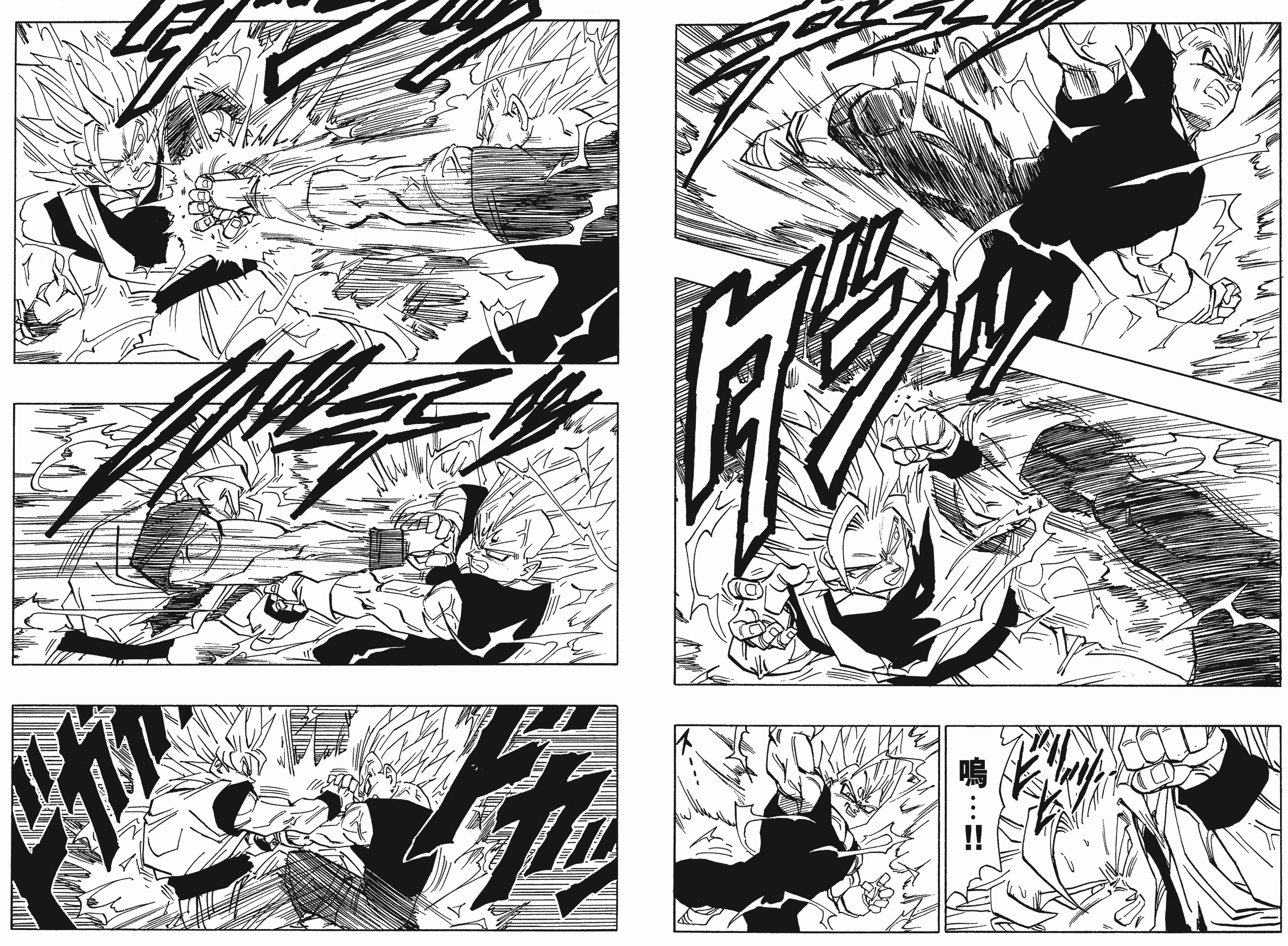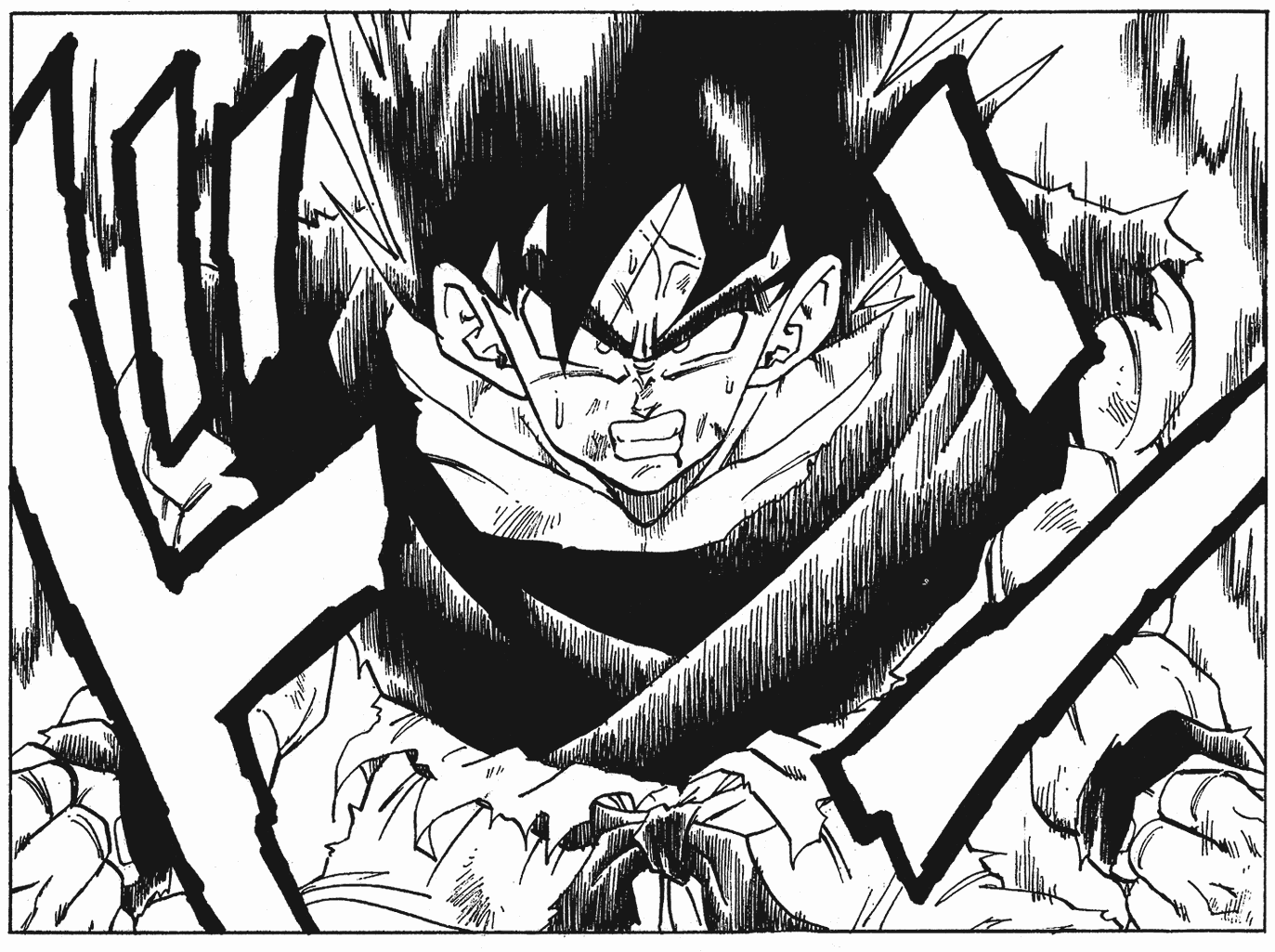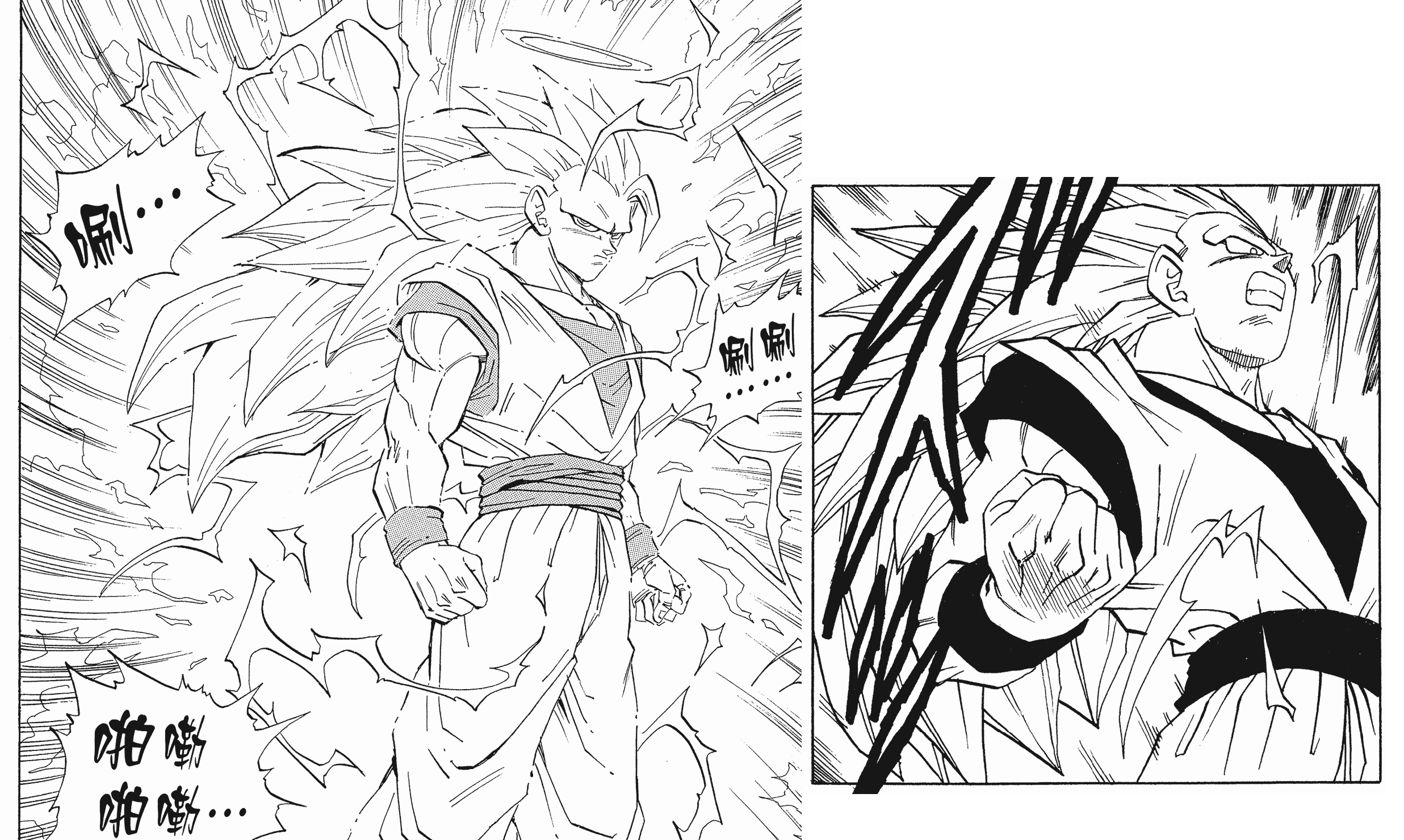 这种状态的帅是很吃角度的,鸟山明在画的时候,更多得用半侧面,因为从这个角度看超级赛亚人3状态下的悟空最酷。头发变长了,战斗的时候看起来很华丽,而且全身的色调都变得有点透明,若有若无的感觉,就像魂魄,可能是因为超级赛亚人3散发出的光更强,几乎是全身发光。