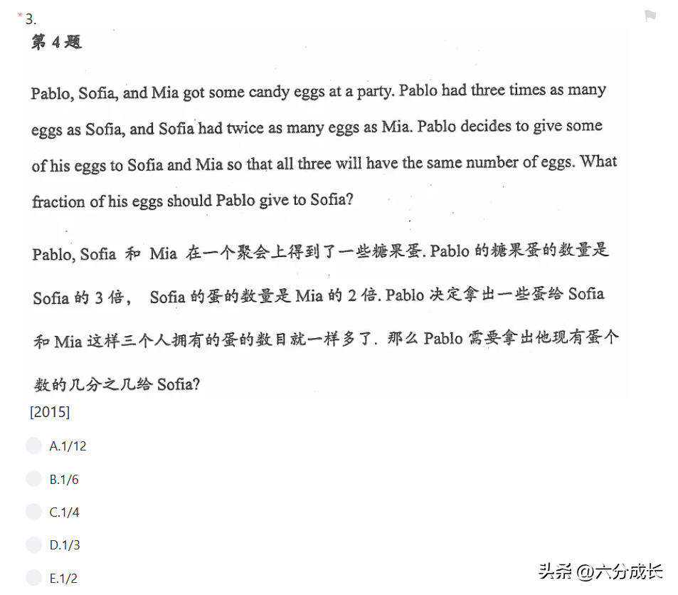 假设Mia一开始有m个蛋,那么Sofia有2m个蛋,Pablo有6m个蛋,均分后,他们每个人有(m+2m+6m)/3=3m个蛋,因此Pablo需要给Sofia蛋的个数是m个,占了他总数的m/6m=1/6,答案选B。