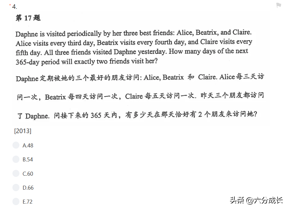 1.当天数是3和4的倍数,但不是5的倍数时,则那天只有Alice和Beatrix访问,Claire没来。1-365内同时是3和4的倍数,即12的倍数的个数为:[365/12]=30天,同时是3、4和5的倍数,即60的倍数的个数为:[365/60]=6天,因此是3和4的倍数,但不是5的倍数的个数为30-6=24天。