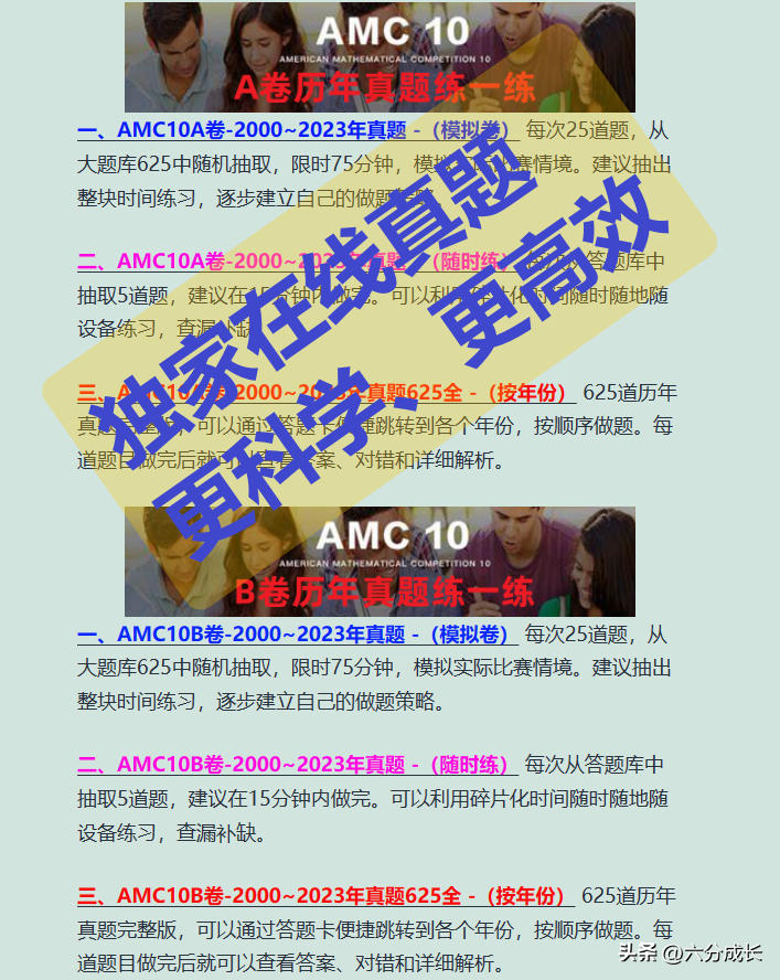 为帮助大家,我整理了2000-2023年的全部AMC10的A卷和B卷的真题共1250题,并且独家制作了多种在线练习,利用碎片化时间,一年足以通过自学在2024年AMC10竞赛中取得好成绩。