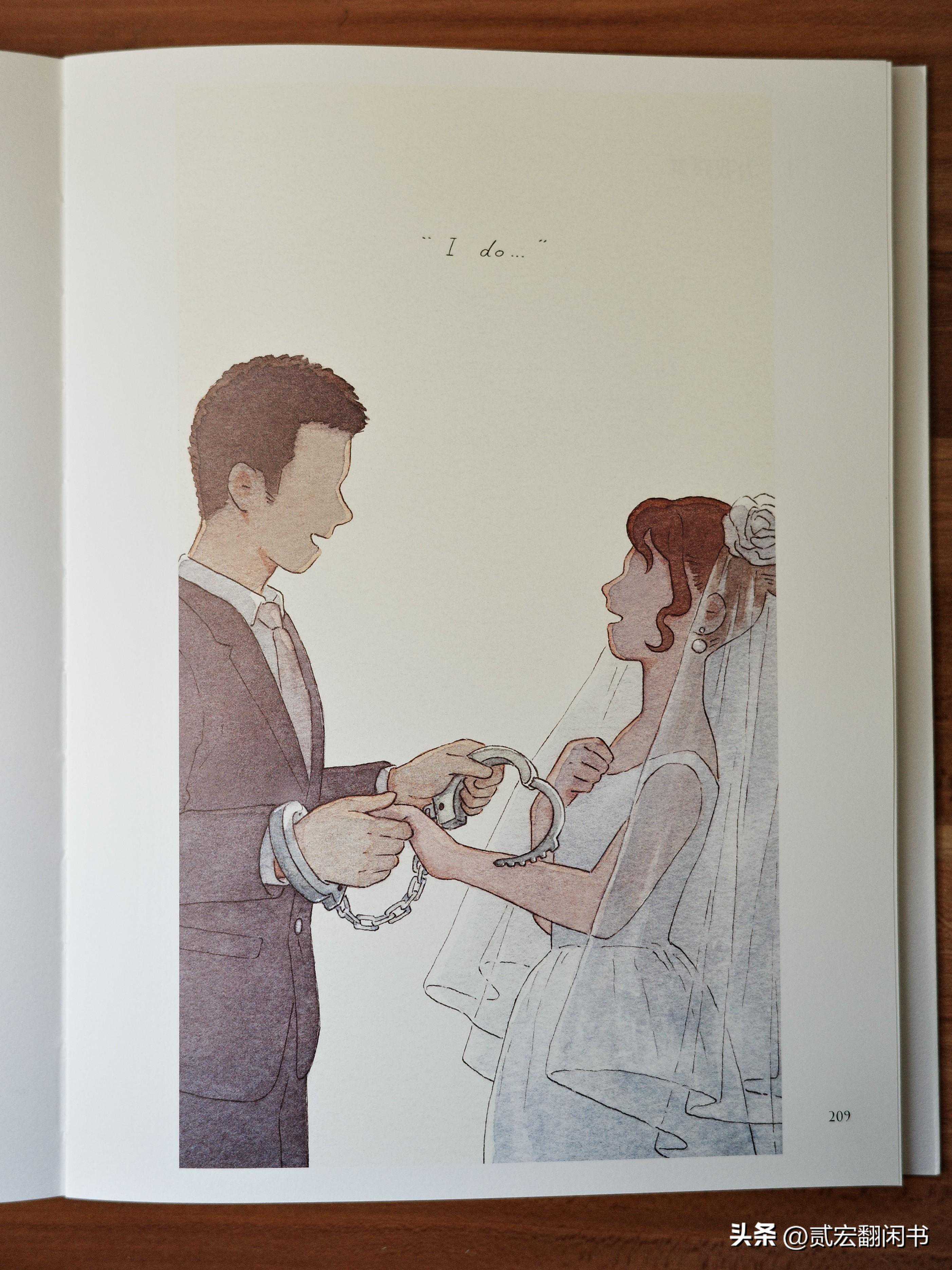 他说,“愿口中的誓词永远是祝福,而不是镣铐”。身着婚礼服装的男女,说着“Ido”的誓言;即将被扣上的镣铐,没有眉目的笑脸。